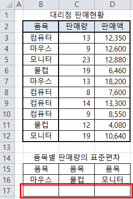 DSTDEV 함수를 이용하여 품목별로 판매량의 표준편차를 계산해 보겠습니다.