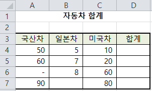 D4 : =SUM(A4:C4) : [A4:C4] 영역의 합계인 21이 [D4] 셀에 입력됩니다.