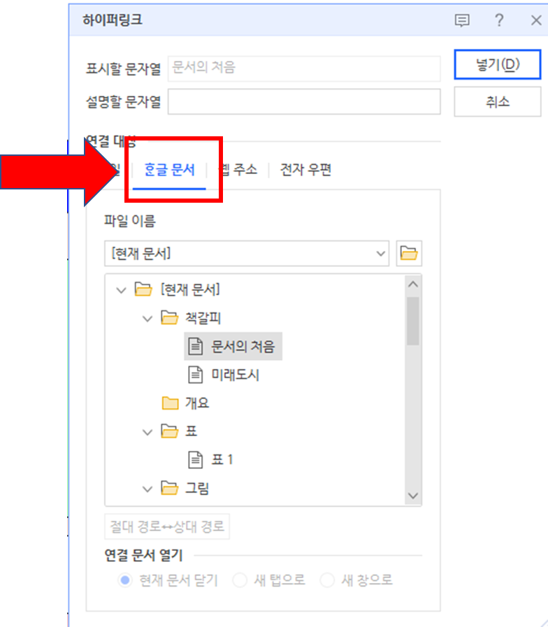 먼저 이동할 위치에 책갈피를 설정(Ctrl+K, B)하고, 해당 텍스트나 개체에 하이퍼링크(Ctrl+K, H)를 설정한 뒤, 하이퍼링크 대화상자에서 '한글 문서' 탭 > '연결 대상: 책갈피'를 선택하여 설정한 책갈피 이름을 지정하면 됩니다.