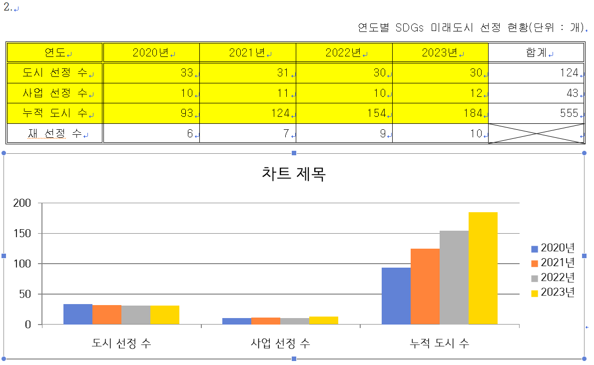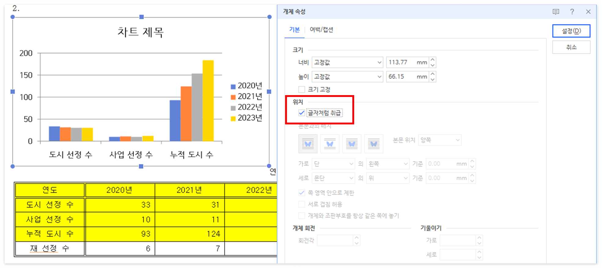 위치 : 글자처럼 취급을 체크 해주면, 표 아래에 차트가 완료 된다. // 아래 그림 참고