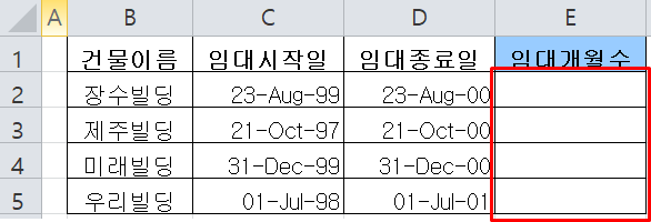 다음표의 ‘임대개월수’를 계산하여 표시하세요.