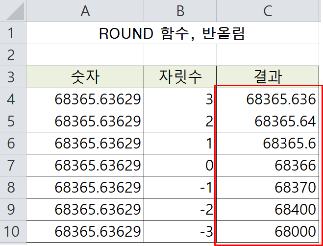 [A4] 셀의 값 68365.63629를 소수 이하 넷째자리에서 반올림하여 소수 이하 셋째 자리까지 표시하므로 68365.636가 [C4]셀에 입력됩니다.