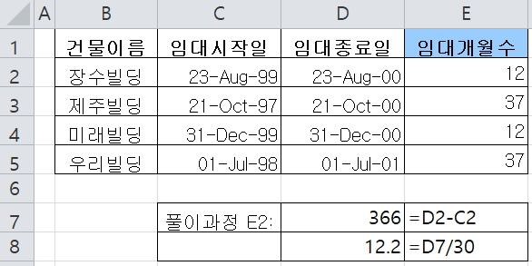 (D2-C2)/30 : [D2] 셀에서 [C2] 셀의 값을 뺀 366을 30으로 나눈 값 12.2가 반환됩니다. 12.2를 함수 공식에 대입하면 다음과 같습니다.