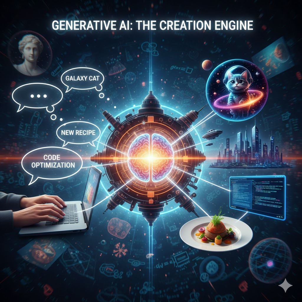 - 요리사 비유: 냉장고에 있는 재료(데이터)를 보고, 단순히 재료 이름을 맞히는 게 아니라 그 재료들로 지금껏 먹어보지 못한 새로운 레시피(결과물)를 만들어 대접하는 요리사와 같습니다.