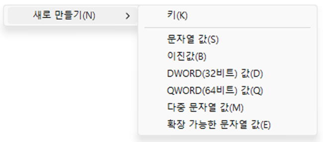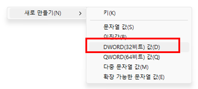 - 오른쪽 빈 공간 우클릭 > [새로 만들기] > [DWORD(32비트) 값] 생성