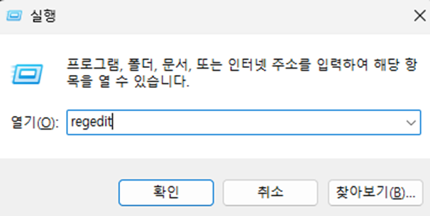 - 실행 방법: Win + R 키를 누르고 regedit를 입력해 레지스트리 편집기를 엽니다.