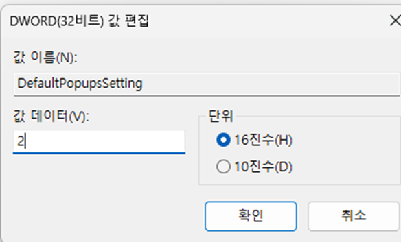 - 값 데이터: 2 (팝업을 허용하지 않음 설정)
