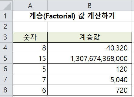 =FACT(A4) : [A4] 셀에 입력된 8의 계승값인