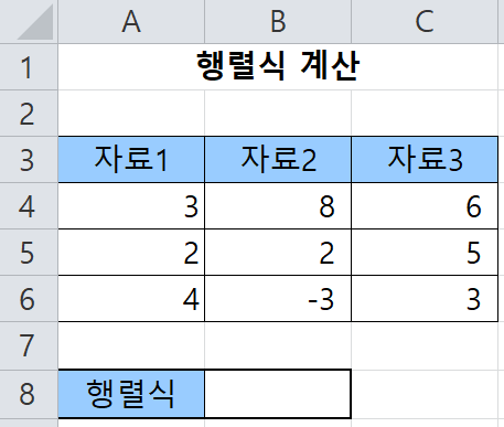B8 : =MDETERM(A4:C6) [A4:C6] 행렬식의 값인 91.0 의 결과값이 입력된다.