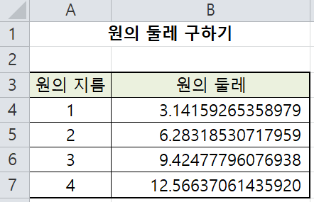=A4*PI() : 원의 둘레는 ‘지름×원주율’이므로 [A4] 셀의 값 1과 PI()를 곱한 값인 3.14159265358979가 [B4] 셀에 입력됩니다.