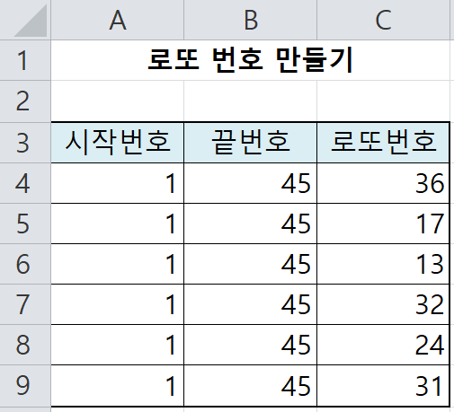 ① =INT(RAND()*(B4-A4+1)+A4) : 0~1 사이의 무작위 수와 1, 45을 이용해 1~45사이의 무작위수가 만들어져 [A4] 셀에 입력됩니다.