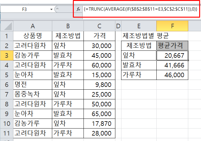 정답 : =TRUNC(AVERAGE(IF($B$2:$B$11=E3,$C$2:$C$11)),0)