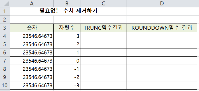 ※ rounddown과 trunc 함수는 구조나 결과값이 비슷합니다. 굳이 구분을 하고자 한다면,