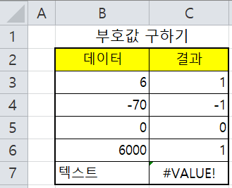 =SIGN(B3) : [B3] 셀의 5는 양수이므로 [C3] 셀에 1이 입력됩니다.