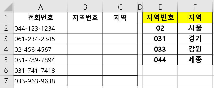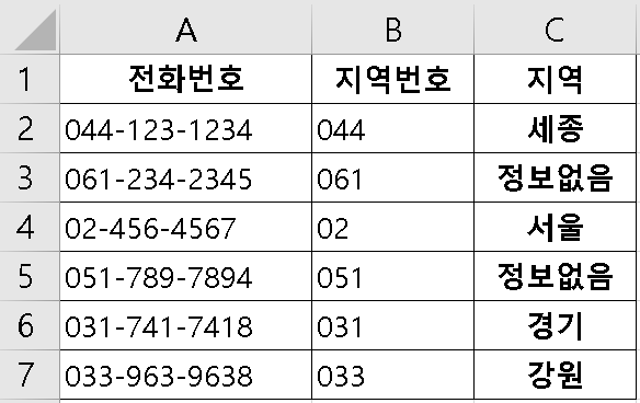 C2 ☞ =SWITCH(B2,"02","서울","031","경기","033","강원","044","세종","정보없음")