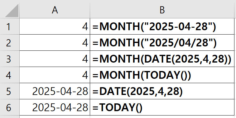 예) =MONTH("2025년4월28일") → #VALUE! 오류 반환