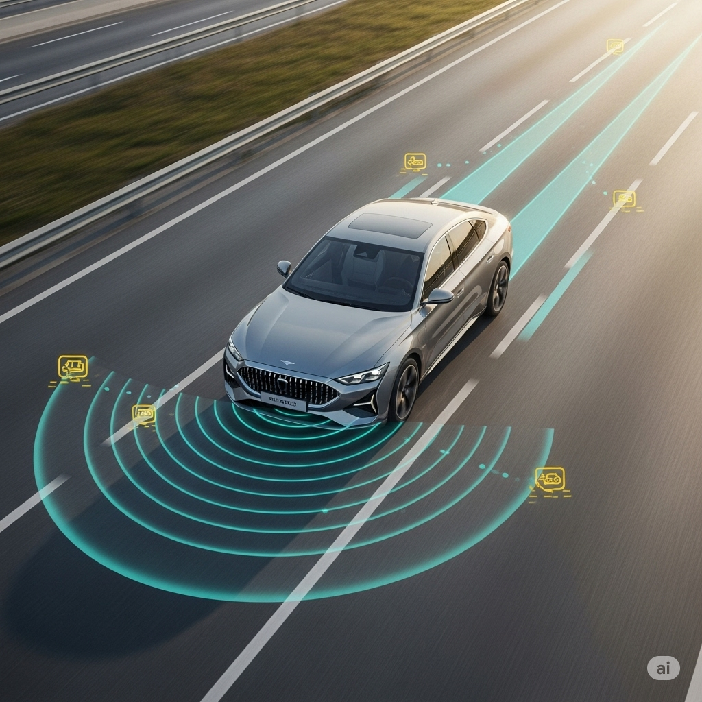 이 이미지는 차선 유지 보조를 나타내는 파란색 선, 적응형 순항 제어를 나타내는 레이더 파동, 그리고 장애물을 감지하는 센서 아이콘 등 ADAS의 다양한 기능을 시각적으로 보여줍니다. 현대적인 차량이 도로를 주행하며 안전하고 자동화된 느낌을 줍니다.
