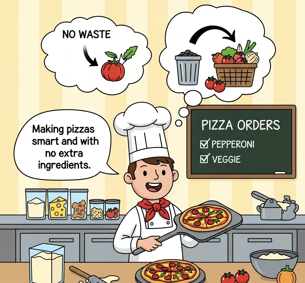 - 손님 주문에 맞춰 빵 굽기 (저스트 인 타임): 손님이 빵을 주문하면 그제야 굽기 시작하거나, 지난주 판매량을 분석해서 딱 팔릴 만큼만 소량씩 자주 굽습니다.