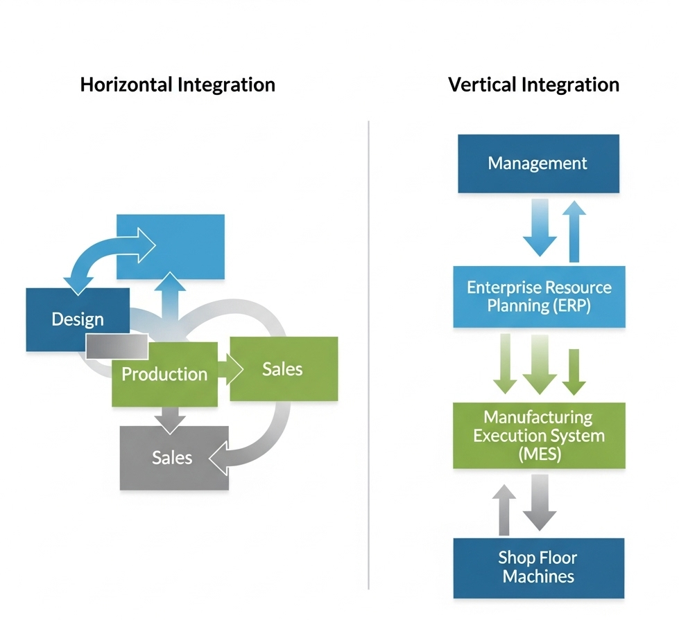 - 수평적 통합은 '옆으로'의 연결성을 강조하여 생산 흐름을 매끄럽게 합니다.
