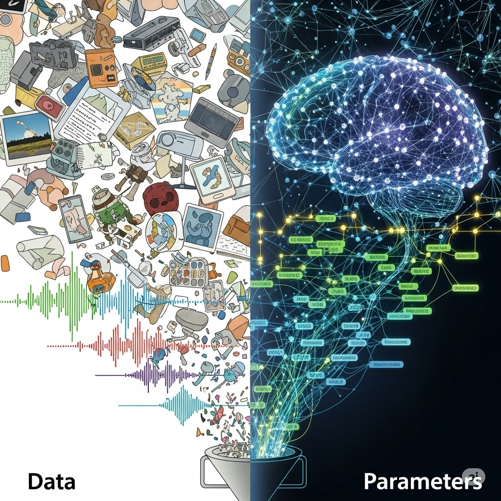 즉, 데이터는 AI에게 '무엇을 배울지'를 제공하고, 파라미터는 AI가 '어떻게 배울지' 그리고 '무엇을 배웠는지'를 나타내는 내부적인 구조이자 지식의 표현이라고 할 수 있습니다.