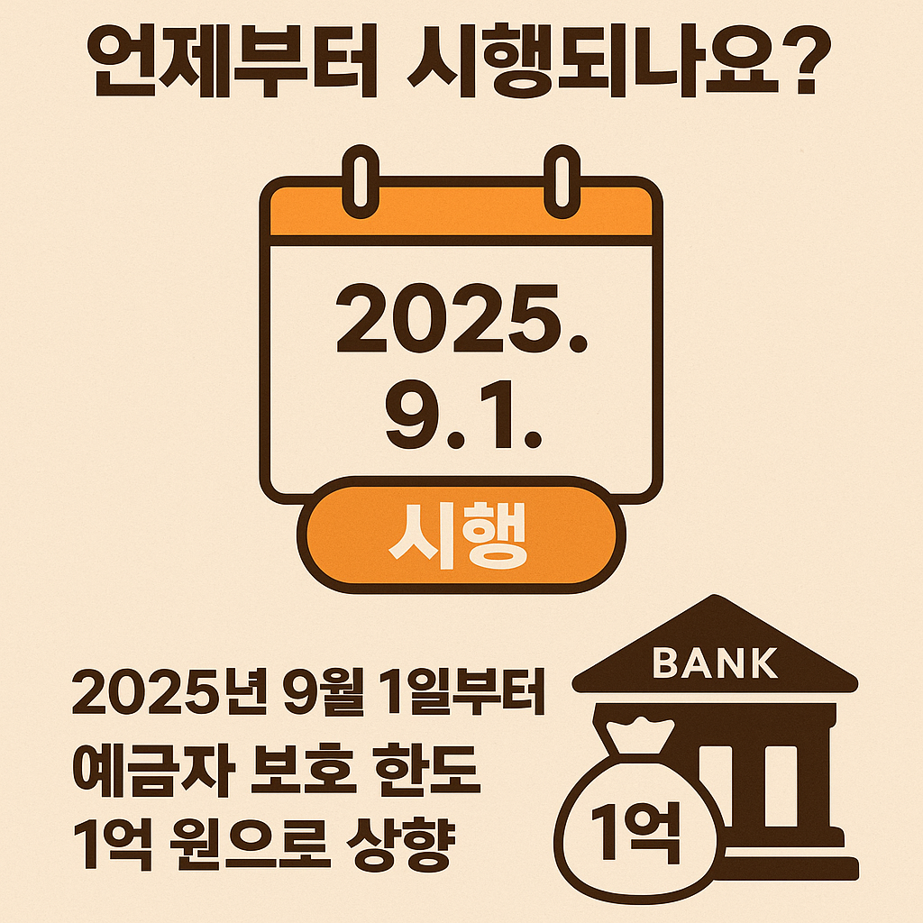 현재 예금자 보호 한도는 1인당 금융기관당 최대 5천만 원이지만, 이 한도가 1억 원으로 상향됩니다. 그리고 시행 시점은 2025년 9월 1일입니다.