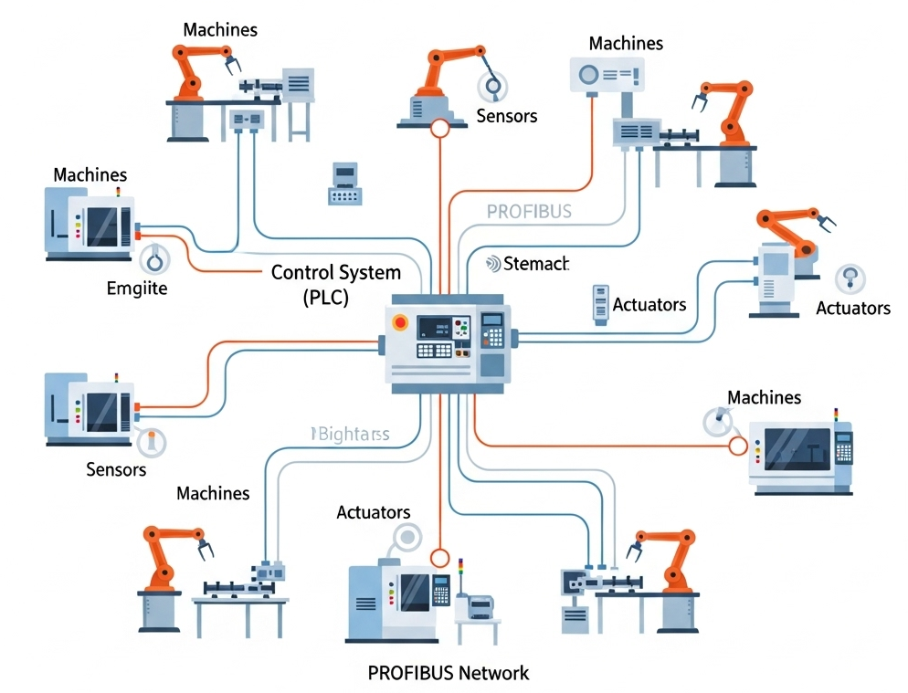 프로피버스는 공장 안의 여러 장치들 (센서, 모터, 로봇 팔 등)이 마치 하나의 신경망처럼 연결되어 서로 빠르고 정확하게 정보를 주고받을 수 있도록 해주는 통신 기술입니다. 이를 통해 공장은 더욱 효율적이고 자동화된 생산을 할 수 있게 됩니다.