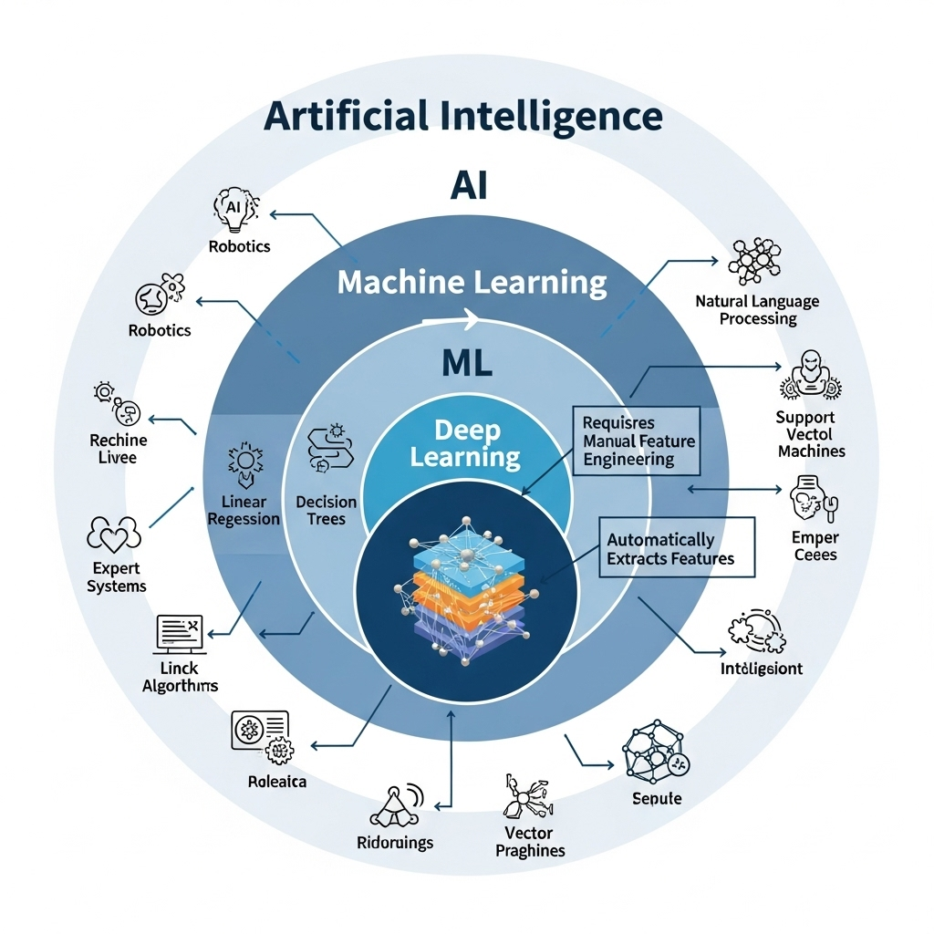 딥 러닝과 머신러닝은 인공지능(AI) 분야에 속하며 밀접하게 관련되어 있지만, 엄연히 다른 개념입니다. 가장 쉽게 이해할 수 있는 관계는 다음과 같습니다.
