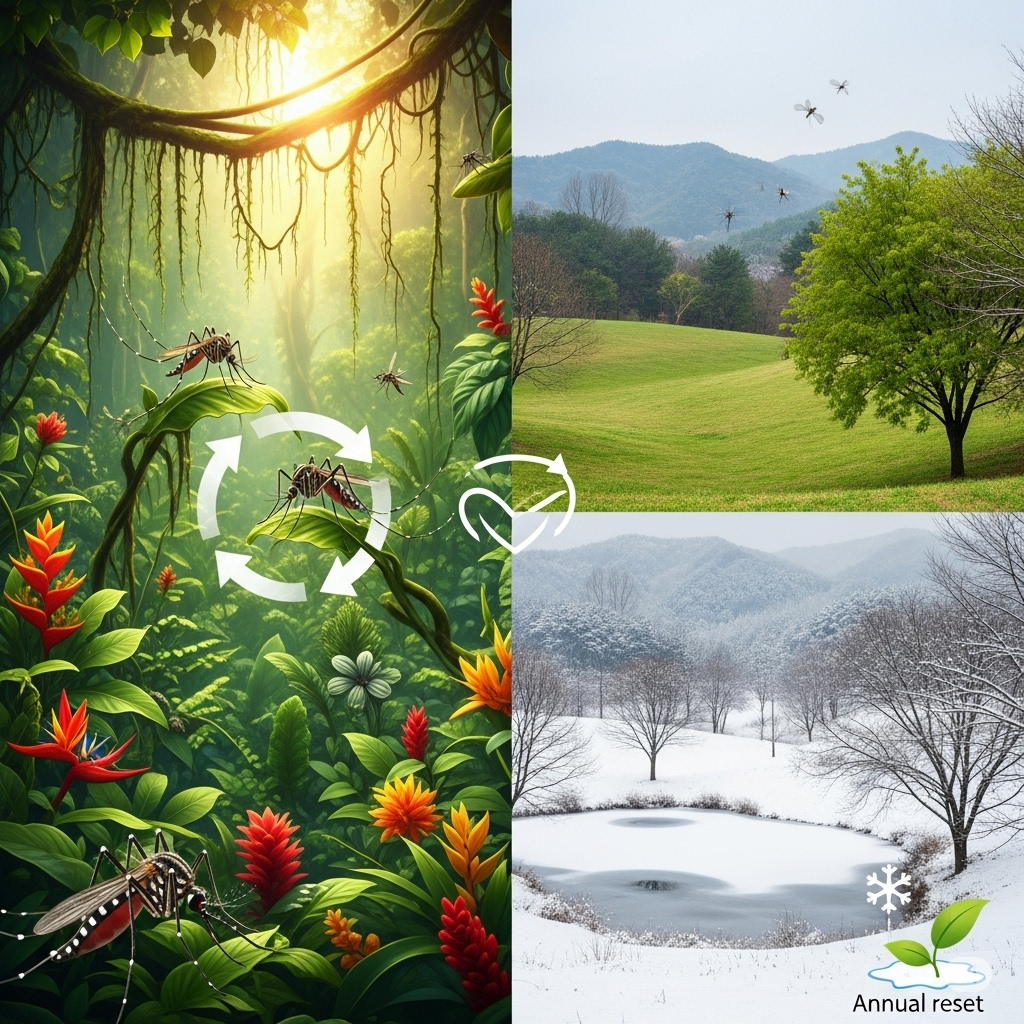 결론적으로, 동남아시아는 연중 모기가 활동하고 바이러스가 지속적으로 순환할 수 있는 환경이기 때문에 더 많은 질병 매개 모기가 존재하고, 이들이 바이러스를 전파할 수 있는 "강력한" 상태로 성장하기 용이합니다. 반면 한국은 계절적인 특성으로 인해 모기 개체군이 매년 새롭게 시작되며, 겨울철 저온이 질병 바이러스의 순환을 끊고 모기의 감염 전파 능력을 제한하는 중요한 요인으로 작용합니다.
