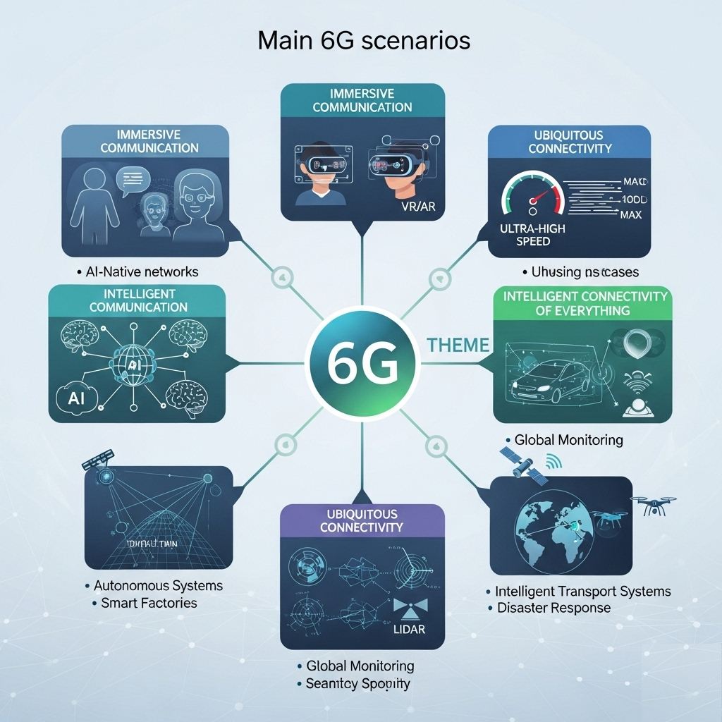 6G 시나리오는 5G의 한계를 뛰어넘어, 더욱 몰입적이고 지능적이며 지속 가능한 미래 사회를 구현하기 위한 핵심적인 서비스 및 기술 방향을 제시합니다. ITU(국제전기통신연합) 및 주요 통신 기업들의 비전에 따르면, 6G는 다음의 세 가지 큰 틀을 중심으로 논의되고 있습니다. 5G의 eMBB, URLLC, mMTC를 확장하고, 여기에 인공지능(AI), 센싱(Sensing), 유비쿼터스 연결(Ubiquitous Connectivity) 등의 새로운 개념이 추가됩니다.