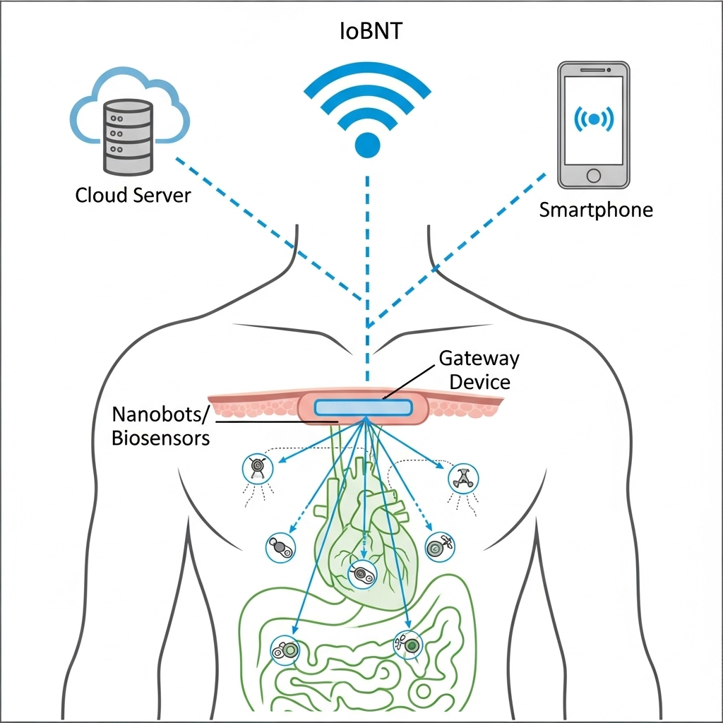 바이오나노 사물 인터넷(IoBNT, Internet of Bio-Nano Things)은 생체 시스템 내부의 생화학적 과정과 사이버 세계를 연결하는 혁신적인 통신 프레임워크입니다. 이는 기존의 사물 인터넷(IoT)이 발전하여, 생체 물질(DNA, 단백질 등)과 인공적으로 만들어진 초소형 나노 장치들을 결합하여 네트워크를 구성하는 개념입니다.