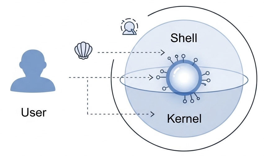 Shell(셸)은 "껍데기"라는 뜻을 가진 단어에서 유래한 것으로, 컴퓨터의 운영 체제(OS)와 사용자 사이를 이어주는 인터페이스 프로그램입니다. 컴퓨터의 핵심인 커널(Kernel)을 감싸고 있으며, 사용자가 입력한 명령을 커널에게 전달하고 커널의 처리 결과를 사용자에게 보여주는 역할을 합니다.