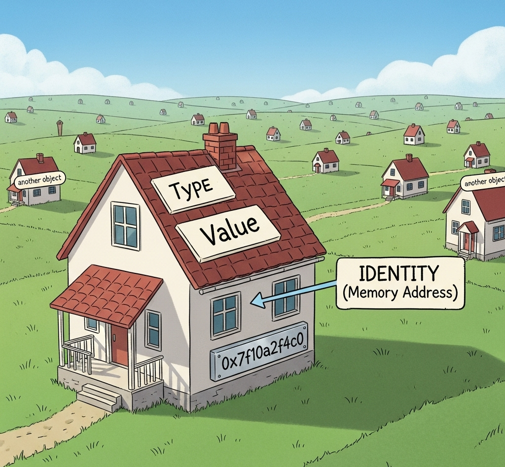 - 식별자 (Identity): 객체가 메모리 어디에 저장되어 있는지 알려주는 고유한 주소입니다. (예: id() 함수로 확인 가능한 값)