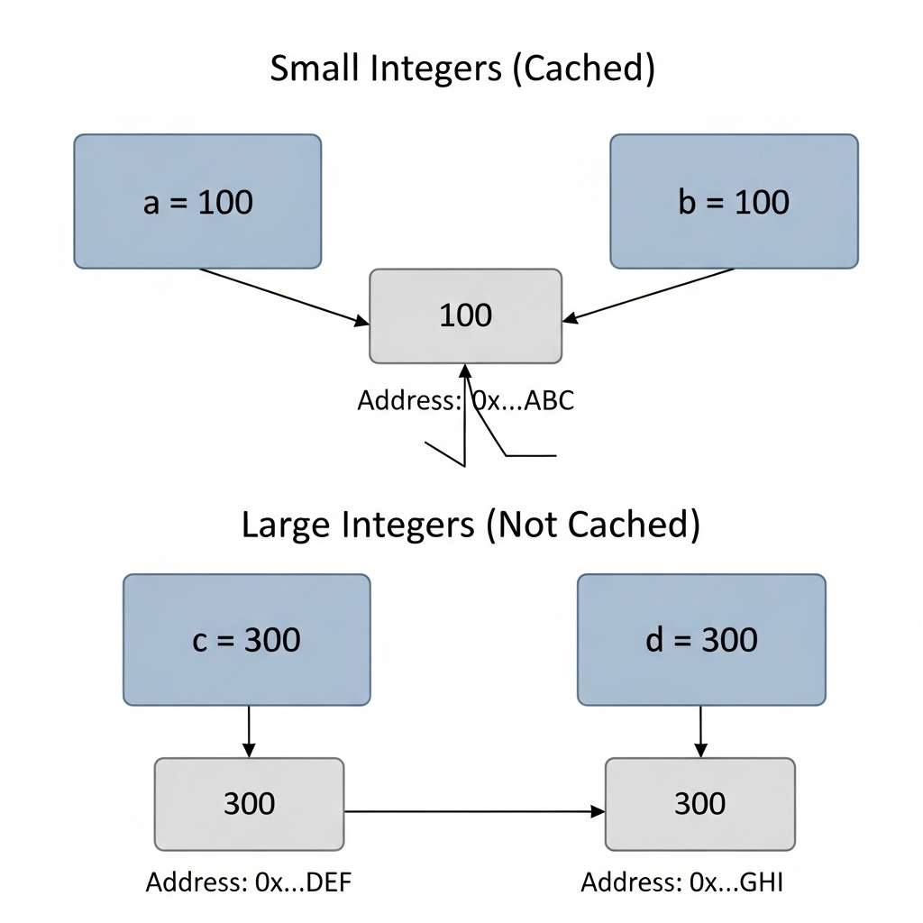 파이썬은 일반적으로 -5부터 256 사이의 정수들을 미리 만들어 두고(캐싱), 이 범위 내의 정수가 필요할 때마다 새로 생성하지 않고 이미 만들어진 객체를 재사용합니다.