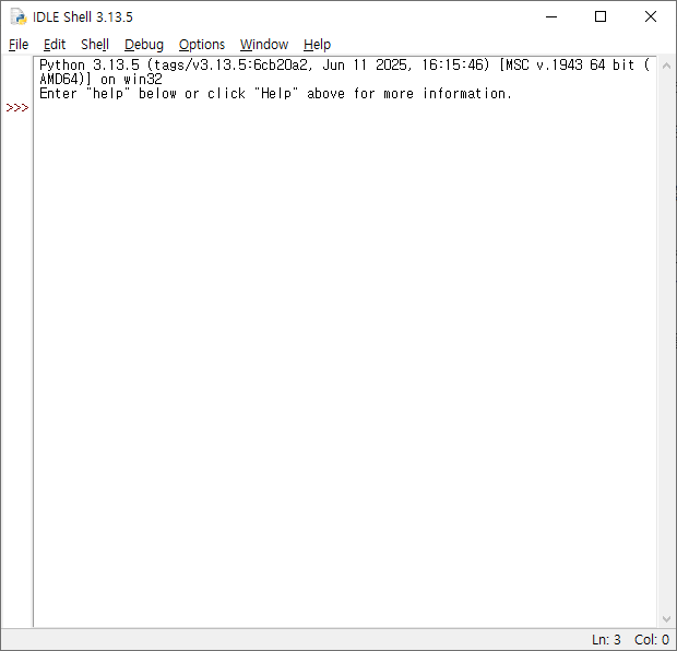 IDLE을 실행하면 파이썬 셸 창이 나타납니다.