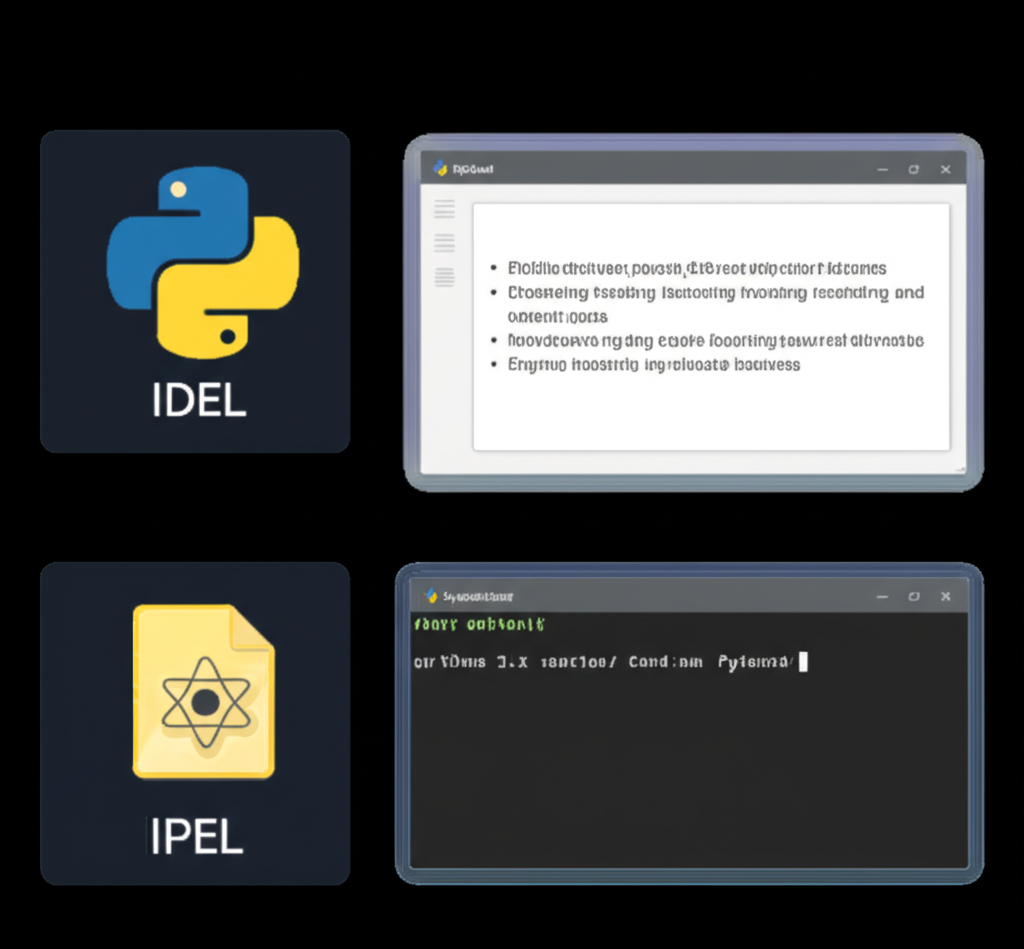- 파이썬 IDLE: 간단한 편집기와 셸 창이 나란히 있는 모습으로, 초보자를 위한 아늑한 작업 공간 느낌을 표현하겠습니다. 창 제목은 'Python IDLE'로 하겠습니다.