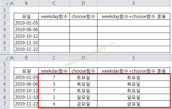 weekday함수를 사용, choose함수를 사용, weekday함수와 choose함수를 혼용해서 각각 출력하도록 해보세요.