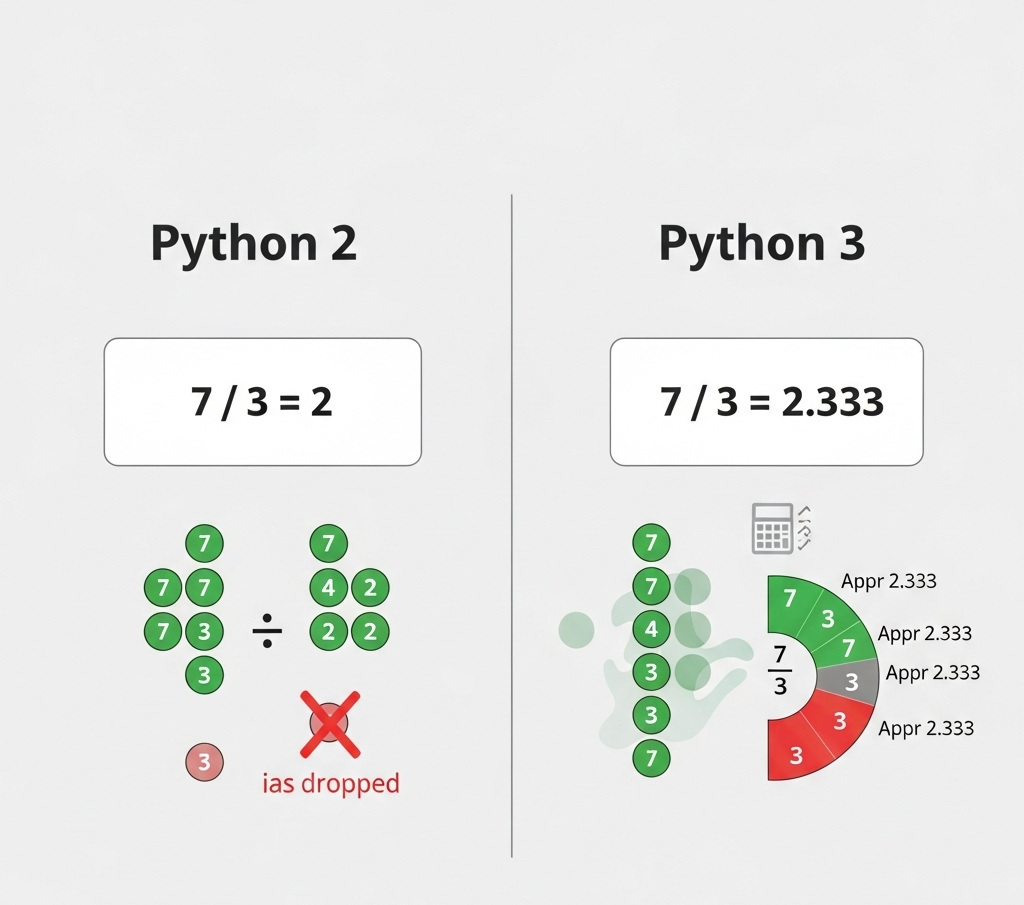 - Python 2:이 경우, 7을 3으로 나눈 몫인 2만 출력되고, 나머지인 1은 버려집니다.
