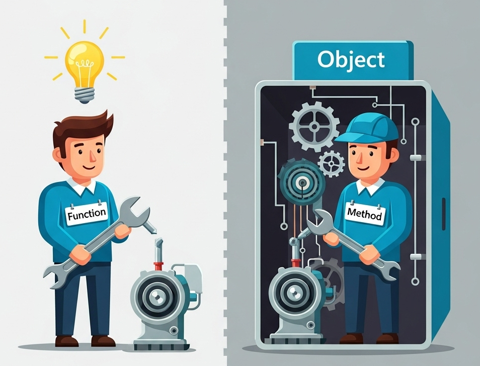 간단히 말해, '함수는 혼자 일하는 사람'이고, '메서드는 특정 팀(객체)에 속해서 팀의 일을 하는 사람'이라고 비유할 수 있어요.