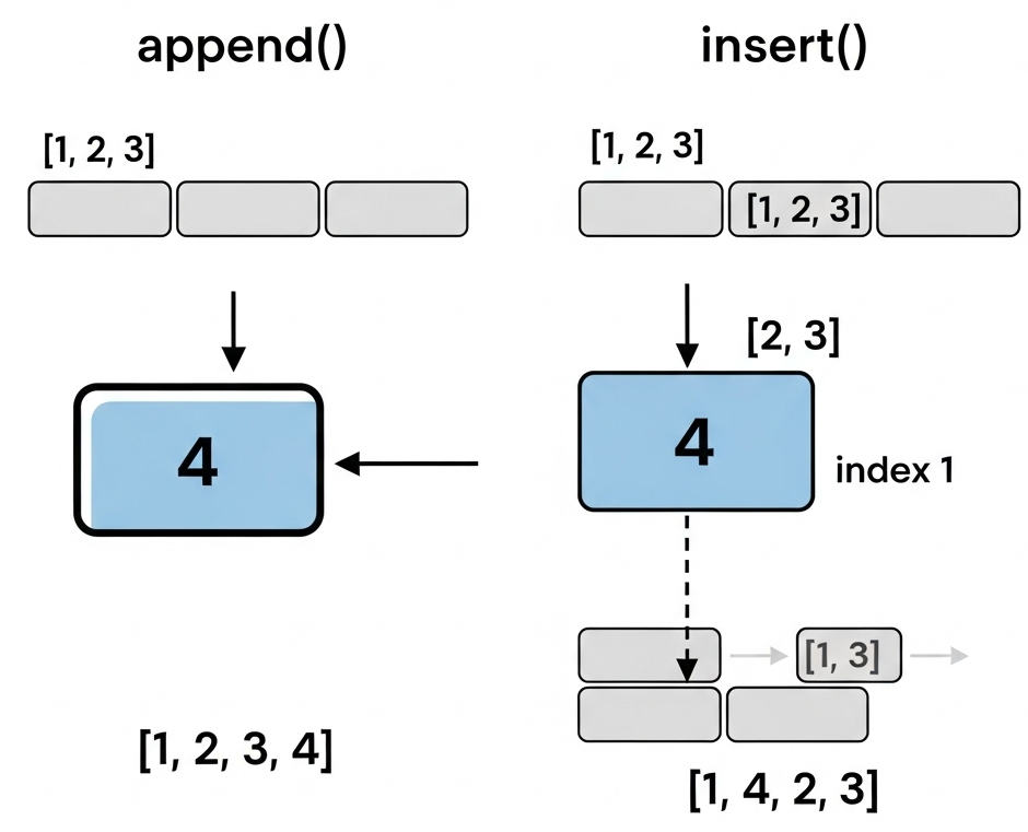 이렇게 append()는 가장 간단하게 끝에 요소를 추가할 때, insert()는 특정 위치에 요소를 삽입해야 할 때 유용하게 사용됩니다.