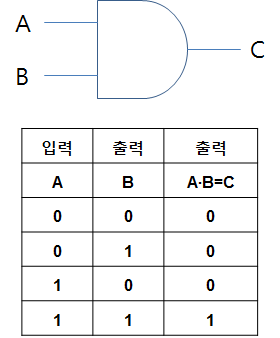여기서의 조건이 A, B 즉, 입력이되며, 이 논리의 곱이 AND함수의 결과값, 즉, 출력 C 값이 되는것이다.