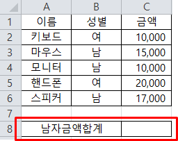 남자의 금액합계를 계산하기 위해서 sum함수를 사용해서 연산을 진행할 때,