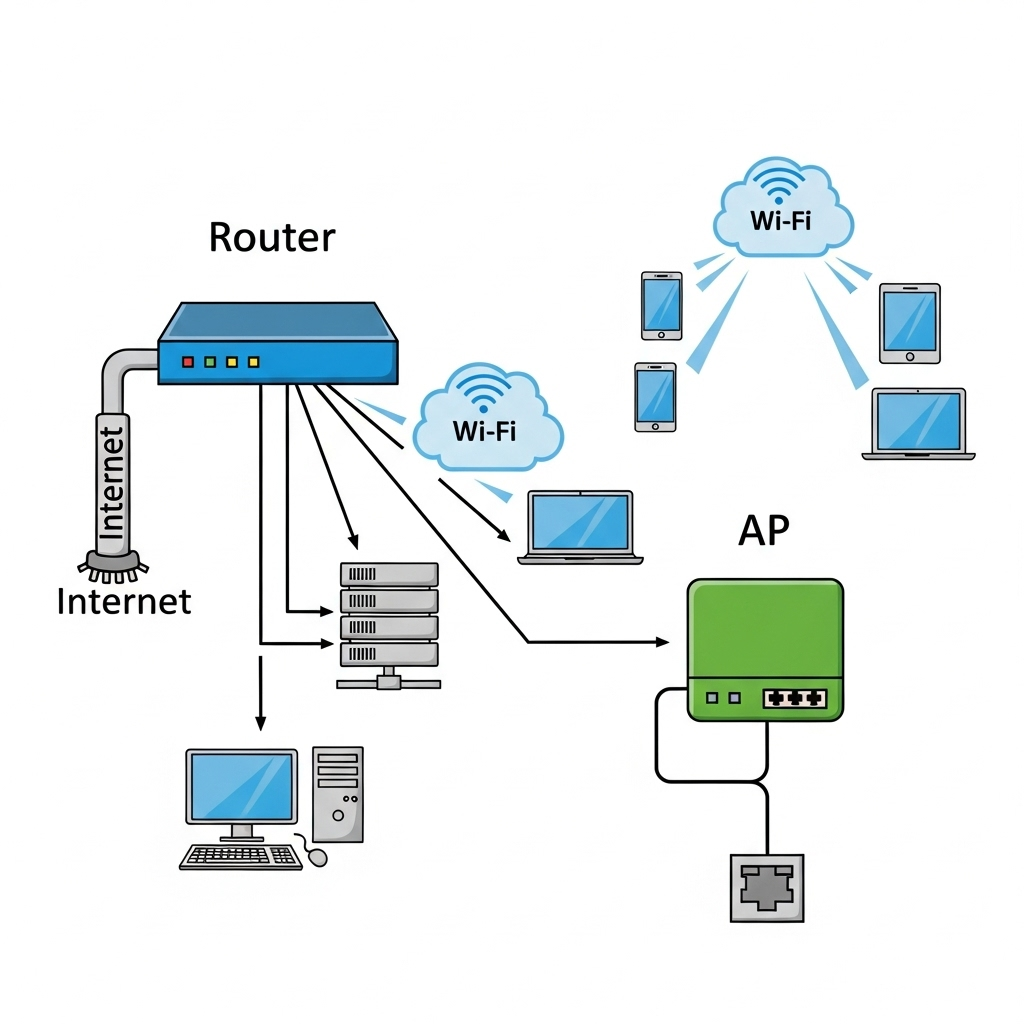 Router는 유선과 무선 네트워크를 모두 관리하는 중심 장치이고, AP는 유선 신호를 무선 신호로 변환하여 Wi-Fi 영역을 확장하는 장치라는 개념을 그림으로 표현해 보았습니다.