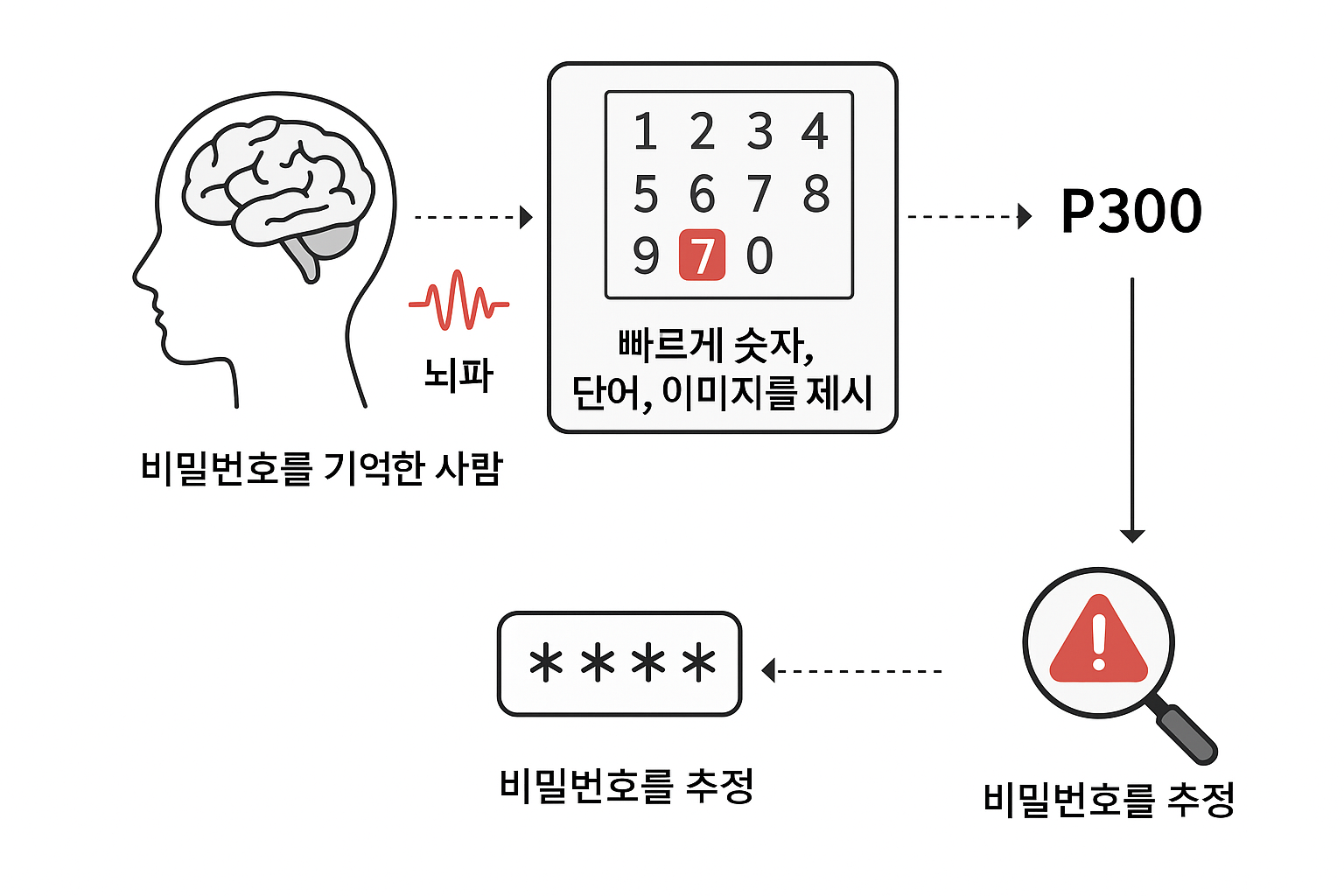 - 만약 그 사람이 그 숫자(예: PIN 번호)나 단어(예: 은행 이름)를 기억하고 있으면, 뇌에서 P300 반응이 나타납니다.