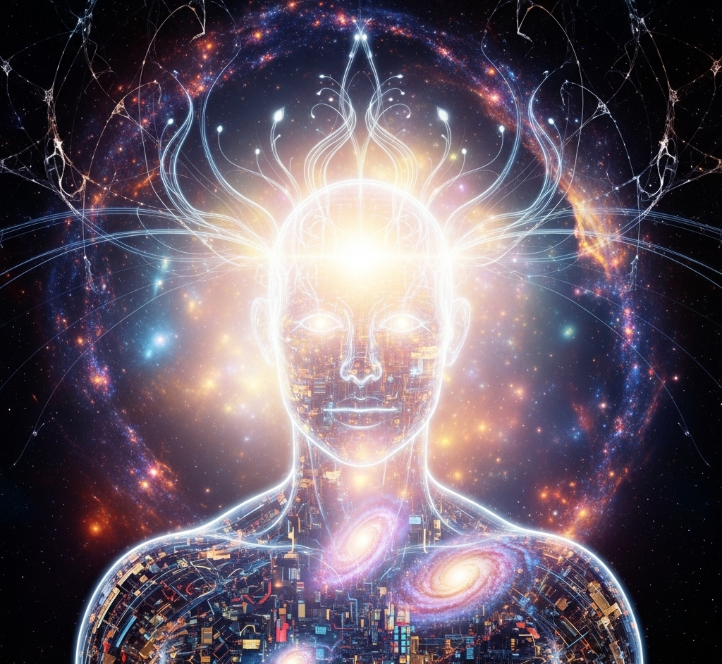 인간의 지능을 훨씬 뛰어넘는 AI입니다. 그림 속 AI는 빛과 추상적인 형태로 표현되어 인간의 이해를 초월하는 압도적인 지능과 능력을 상징합니다.