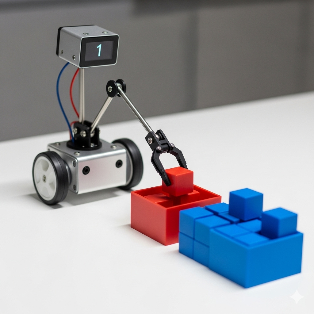 특정 작업을 수행하는 데 특화된 AI입니다. 그림 속 로봇은 정해진 색깔의 블록을 분류하는 단일 작업을 수행하고 있으며, 오직 그 목적에만 집중하고 있습니다.