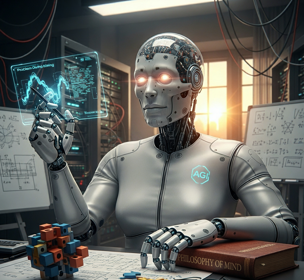 인간처럼 다양한 지적 작업을 수행할 수 있는 AI입니다. 그림 속 로봇은 복잡한 문제들을 해결하고, 배우고, 생각하며 여러 분야의 지식을 다루는 모습을 보여줍니다.