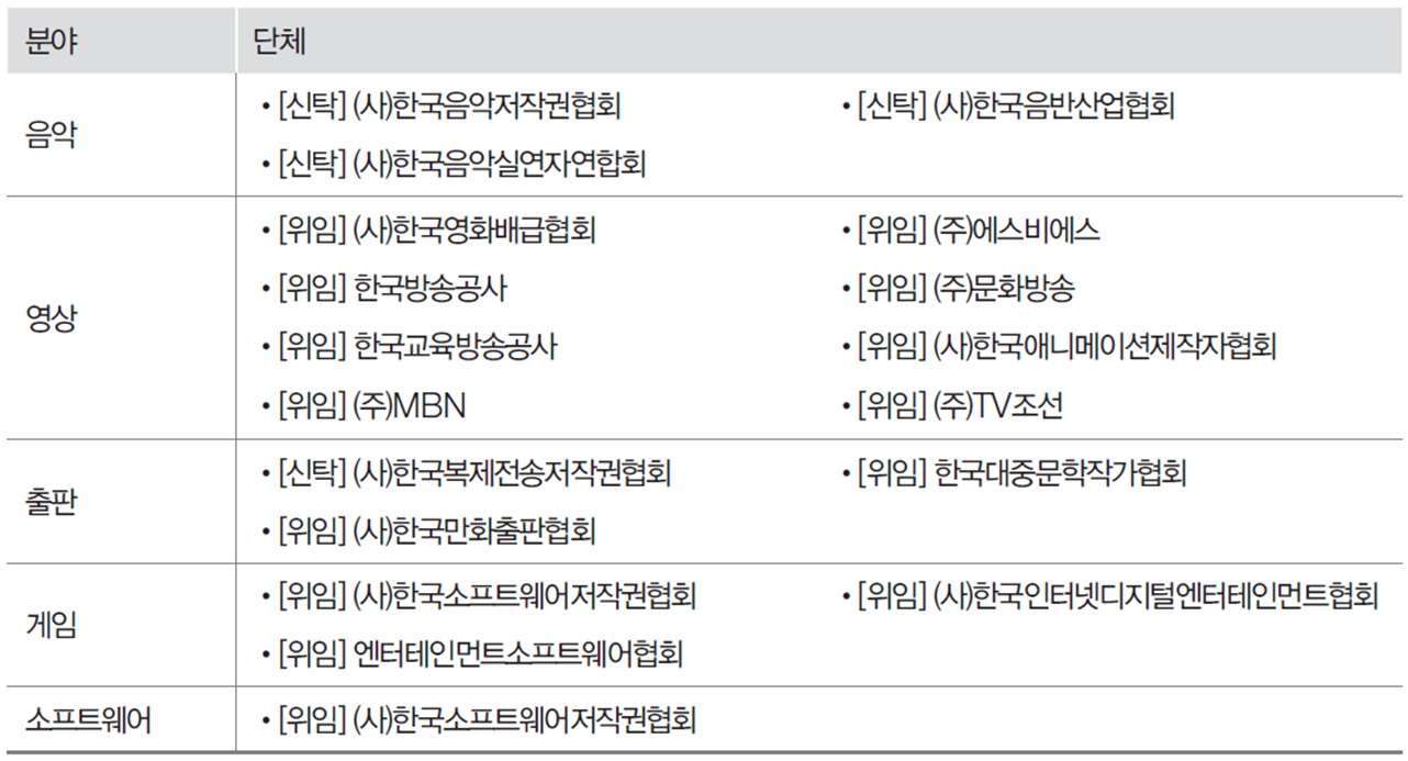 | 영상 | KBS, SBS, 영화배급협회 등 | 영상물 사용료 관리 |