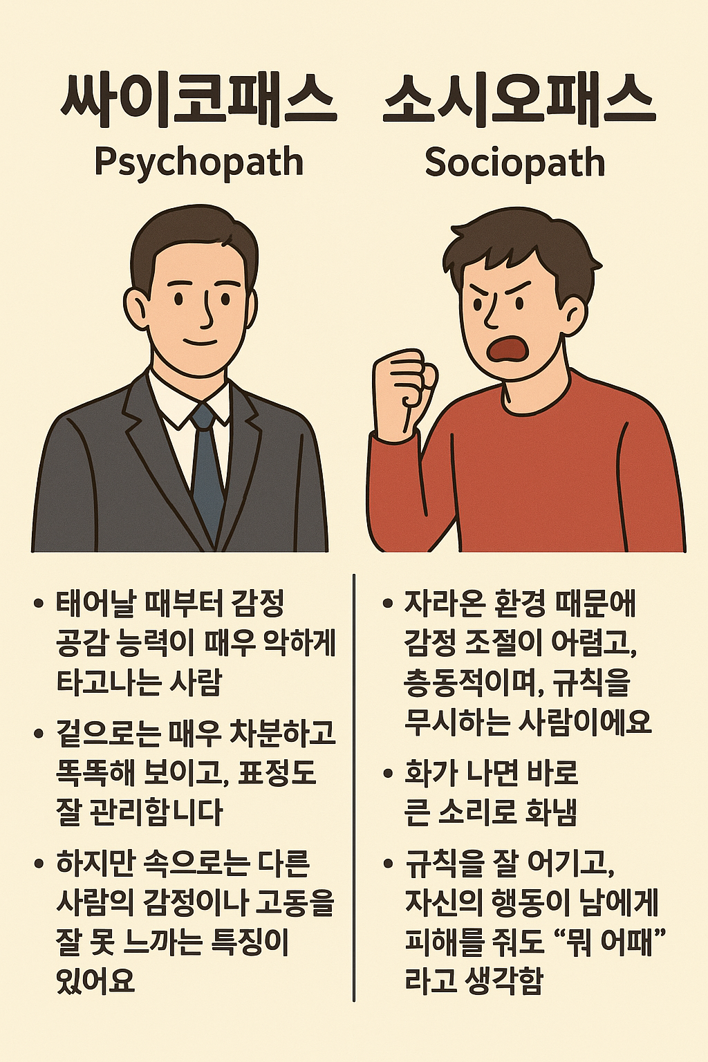 - 소시오패스: 속과 겉 모두 충동적이고 감정 조절이 어려운 사람