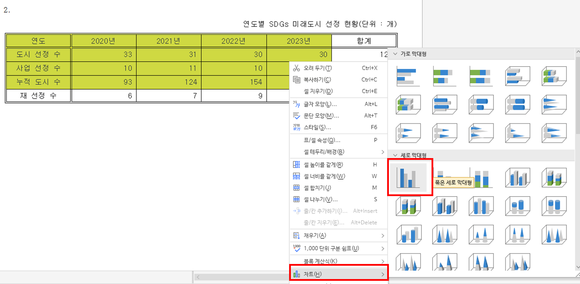 표의 노랑색 부분 블럭 잡고 마우스 오른쪽 버튼 > 차트 > ex) 묶은 세로막대형