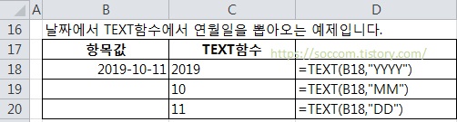예제) 날짜에서 TEXT함수에서 연월일을 뽑아오는 예제입니다.